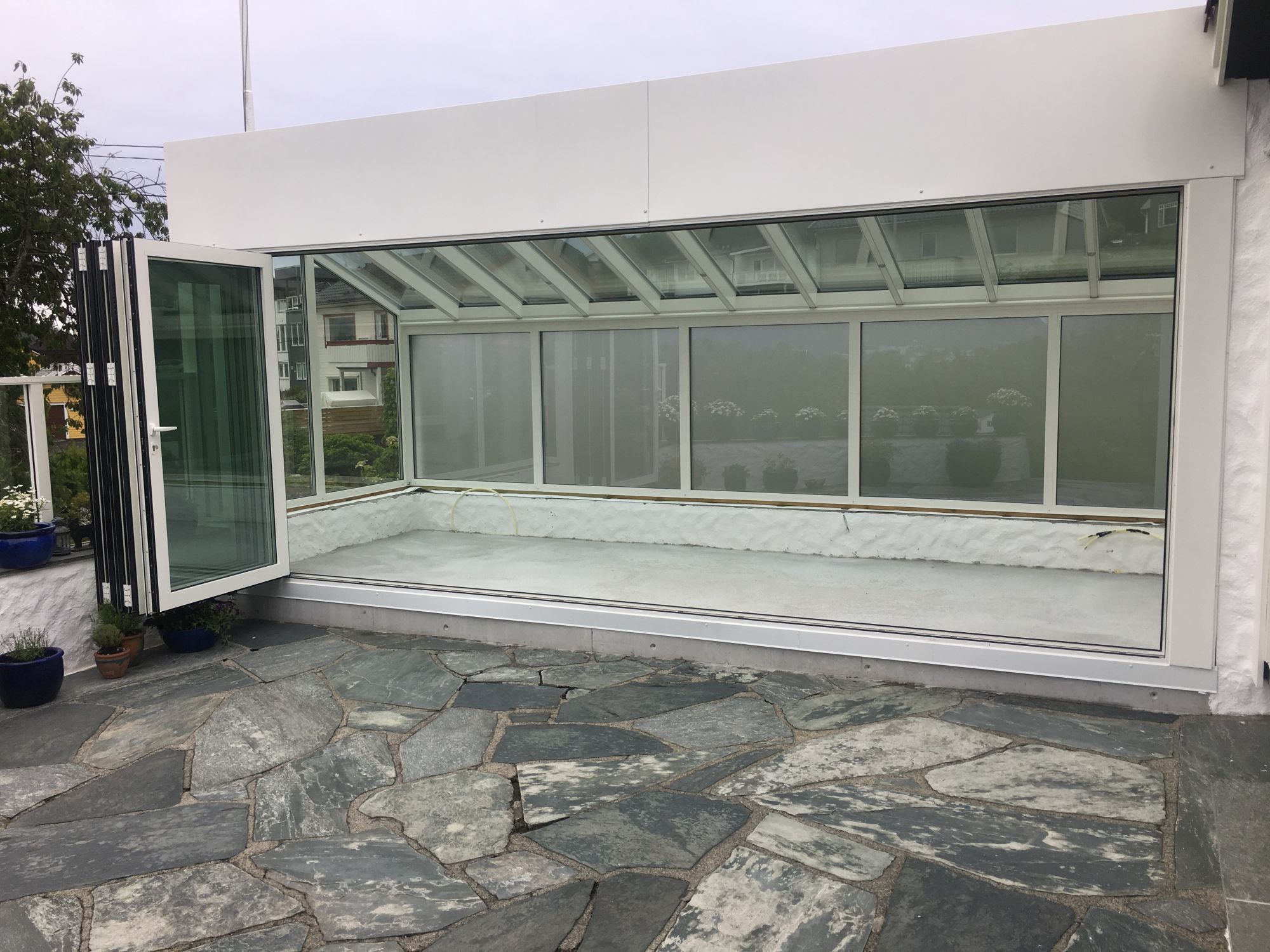 Det første vi må gjøre er å bestemme utforming og fasong på din nye veranda. Her tar man hensyn til bygningen den skal knyttes sammen med. Kontraster er ofte bedre enn noe som passer sånn «noenlunde». Det er lurt å bruke god tid på planleggingen av ditt nye uterom og studere mulighetene nøye både når det gjelder utforming, farge, isolasjon og glasstype. Til sommerbruk er jo gjerne ikke isolasjon det man legger mest vekt på, men husk at mange ønsker å benytte sitt nye, lyse og trivelige uterom langt mer enn man først hadde tenkt. Og da er det jo dumt å ha valgt “feil” løsning.