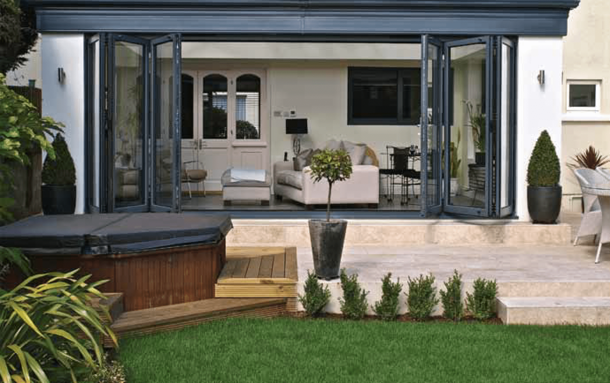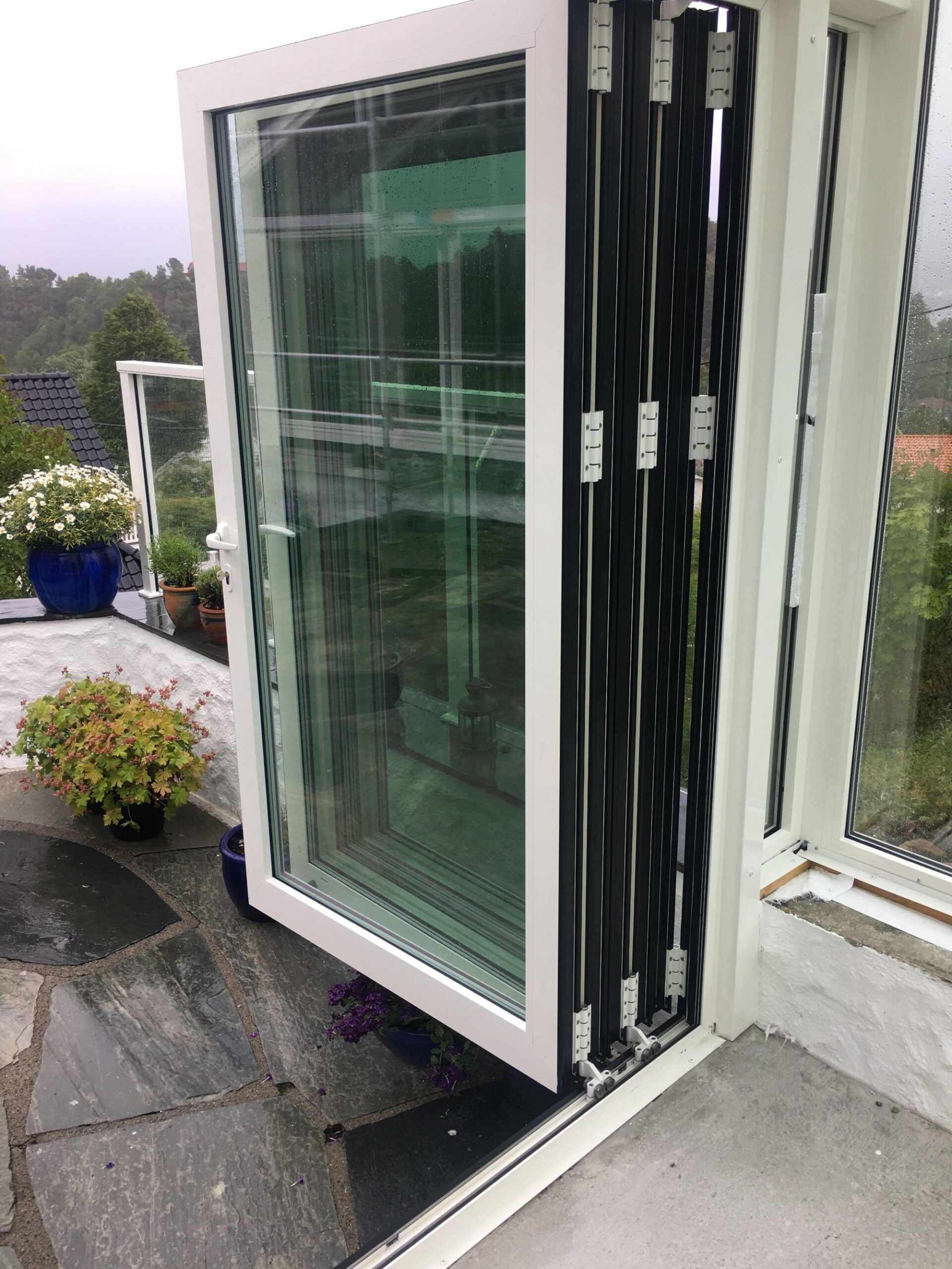 Ønsker du å viske ut skillet mellom inne og ute? Da er foldedører det perfekte valget som gir deg maksimal åpning. Med et enkelt håndgrep foldes dørene sammen til en smal pakke på utsiden. Dørene kan konstrueres slik at de kan brukes som en gangdør når du ikke ønsker å åpne hele veggen. Våre foldedører leveres med 3-lags glass og god u-verdi i profilserien EXTREME